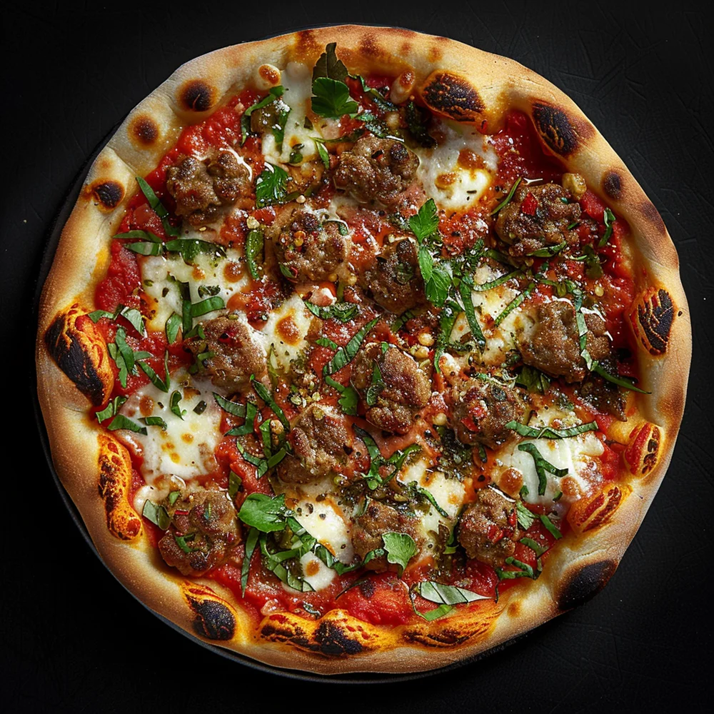 Masa crocante, tomate, mozzarella, kofta y orégano.